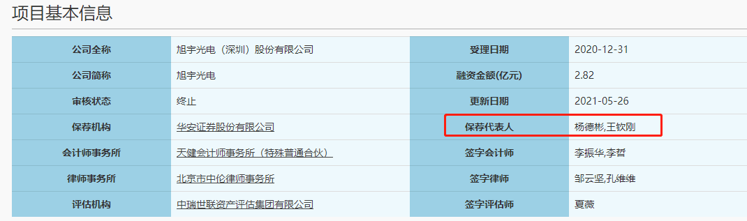 我们关注到,旭宇光电有一位保荐代表人在“首发”(IPO)项目方面“经验少”。旭宇光电的保荐代表人是杨德彬和王钦刚。