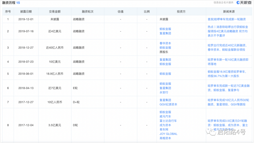 天眼查信息显示,2017年12月到2019年12月,哈啰出行一共获得8轮融资,总额超过200亿人民币,8轮融资中蚂蚁金服领投或者跟投5轮。在蚂蚁金融的光环,哈啰出行也成为市场红人,复星集团、春华资本、高榕资本、GGV纪源资本等机构相继入局。