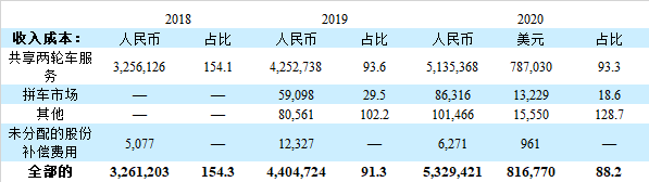 从成本端来看,共享单车同样占据较大比例,2020年成本达51.35亿元,占比达93%,从成本的构成来看折旧费用占据较大比例。