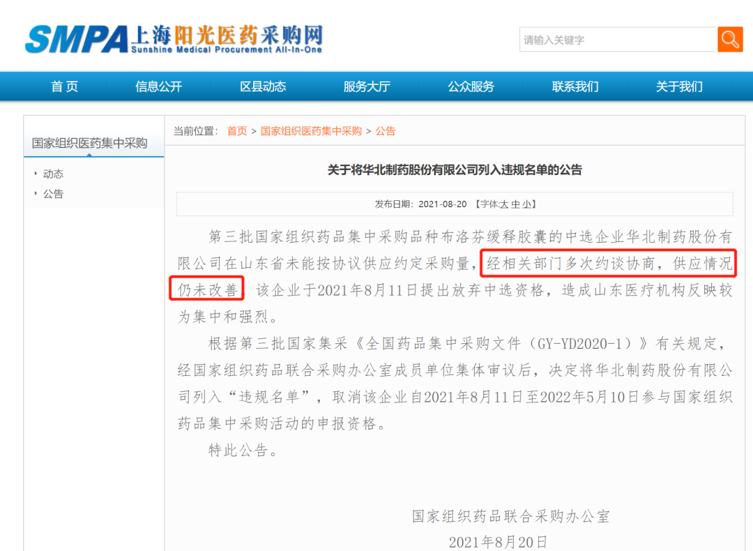 8月20日,上海阳光药品采购网发布《关于将华北制药股份有限公司列入违规名单的公告》,第三批国家组织药品集中采购品种布洛芬缓释胶囊的中选企业华北制药股份有限公司在山东省未能按协议供应约定采购量,经相关部门多次约谈协商,供应情况仍未改善。