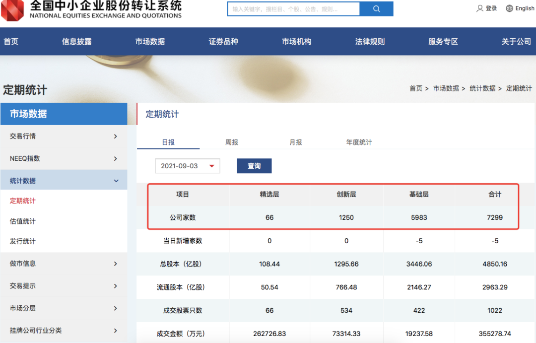 8年以来,新三板一直在深化改革。截至9月2日,新三板挂牌企业合计7299家,其中,精选层66家,创新层1250家,基础层5983家,总流通股本2963.29亿股。