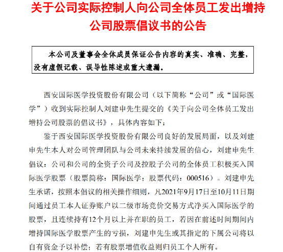 公司实控人刘建申承诺,按照本倡议的相关操作细则,凡2021年9月17日至10月11日期间通过员工本人证券账户以二级市场竞价交易方式净买入国际医学的股票,且连续持有12个月以上并在职的员工,若因在前述时间期间内增持国际医学股票产生的亏损,刘建申或其指定的下属公司将以自有资金予以补偿;若有股票增值收益则归员工个人所有。