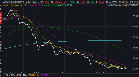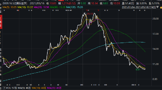 截至9月16日,国际医学收盘价10.03元/股,近三个半月跌幅达53.69%。公司市值也一路走低,缩水约265亿元。