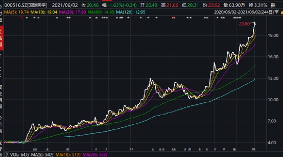 今年6月2日,国际医学在盘中创出了21.66元/股的近五年新高, 同时公司市值约达到492.98亿。