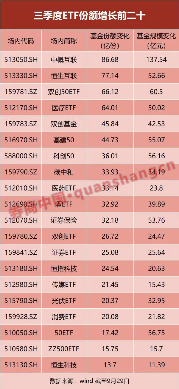 Wind数据显示,截至9月29日,中概互联(513050)、恒生互联(513330)自三季度以来份额分别增长了88.68亿份、77.14亿份,居三季度ETF份额增长前二,如果按区间成交均价粗略计算,两只ETF分别在三季度吸金137.54亿元、52.66亿元。