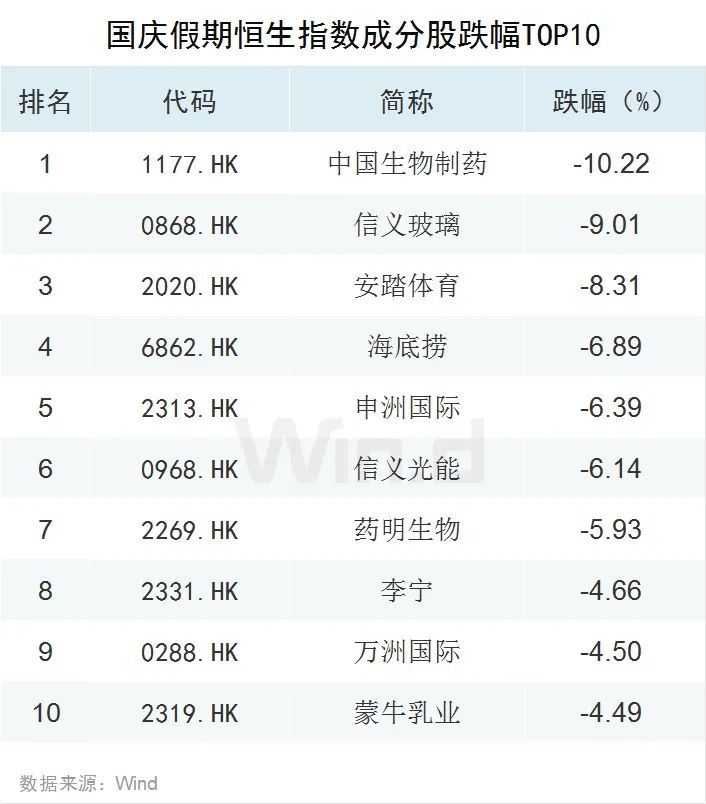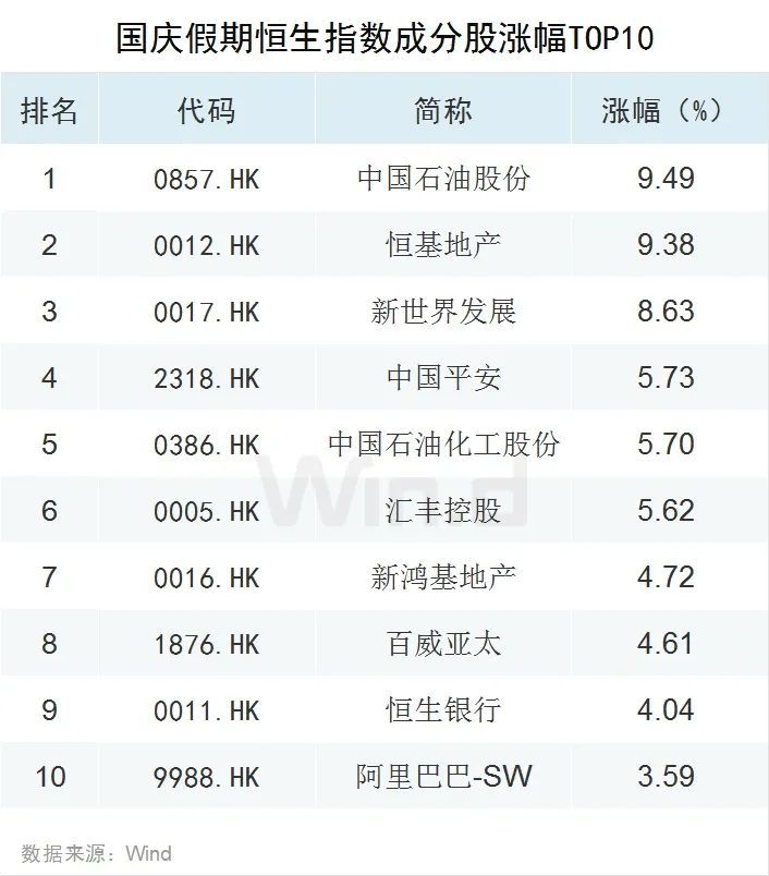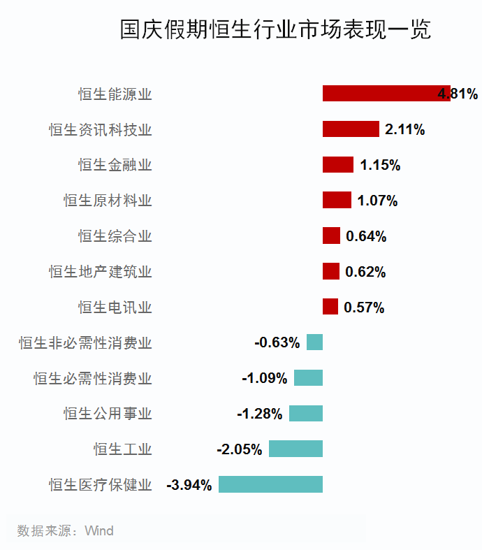 国庆期间,恒指能源行业涨幅接近5%,一马当先。行业表现具体如下: