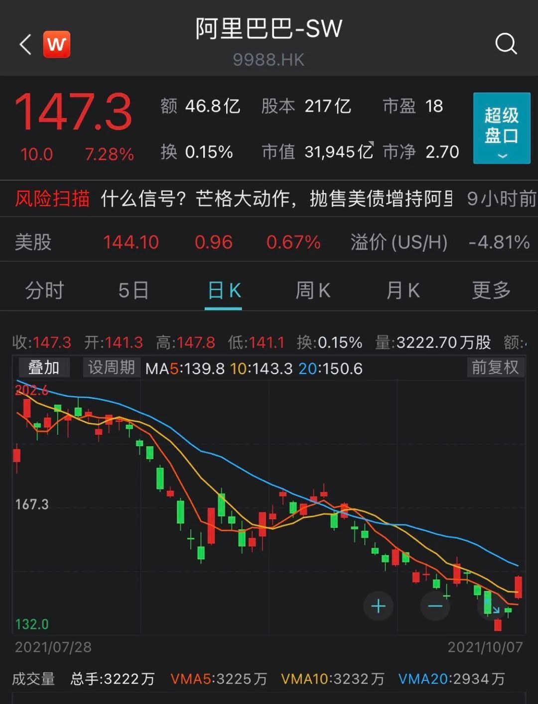 今年8月,公开表示“越跌越买”的段永平称,抄底了阿里巴巴和腾讯。