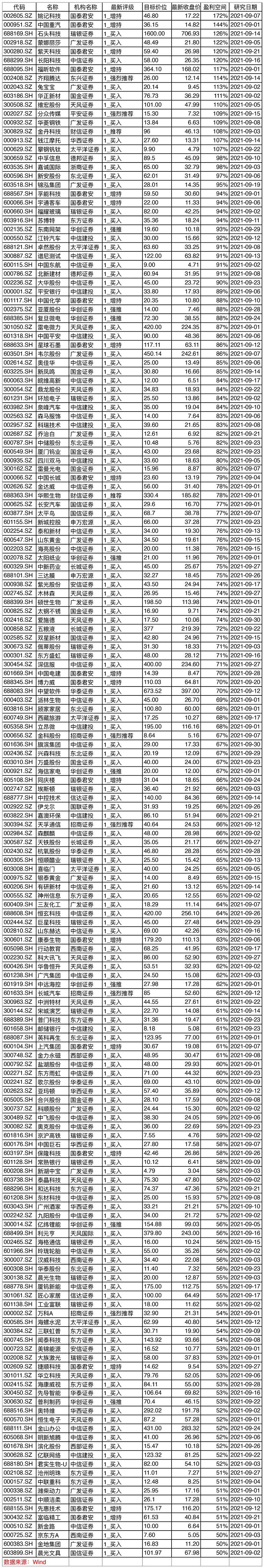 中国重汽、石头科技、蒙娜丽莎、紫天科技、长阳科技的预期盈利空间也超过了120%。福昕软件、齐翔腾达、兔宝宝、华正新材、维宏股份、分众传媒、华菱钢铁、金丹科技、钱江摩托、攀钢钒钛的预期盈利空间超过100%。
