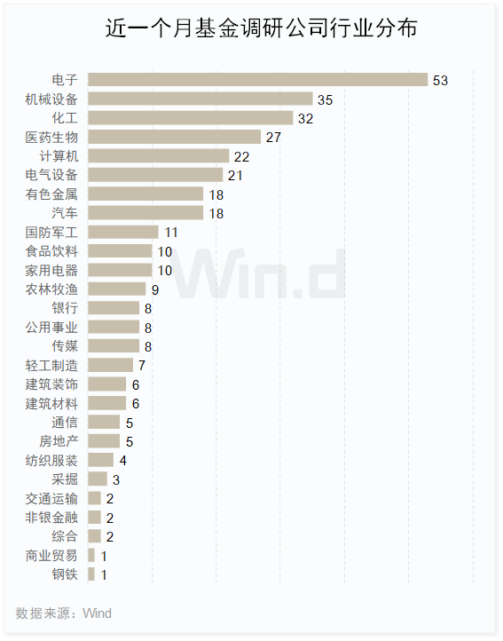 基金调研动向方面,Wind数据显示,近一个月以来,A股共有334家上市公司接待了基金公司调研。被调研公司主要集中在电子、机械设备和化工三大行业,涉及公司数量分别为:53家、35家和32家。
