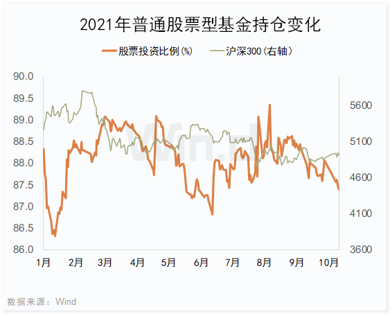 具体来看,截止10月15日,普通股票型基金仓位已跌破88%关口,为87.39%,较10月初下降0.68个百分点,较8月份高点下降1.96个百分点。