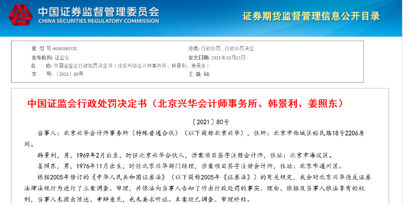 证监会认为,北京兴华会计事务所未能勤勉尽责,责令北京兴华会计师事务所改正违法行为,没收审计业务收入100万元,并处以100万元罚款。
