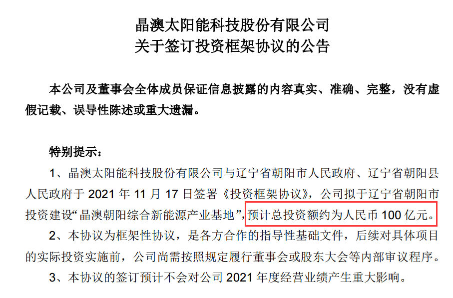 11月17日晚间,晶澳科技公告,拟投资约100亿元建设“晶澳朝阳综合新能源产业基地”,这是该公司在今年宣布的第三个百亿项目。