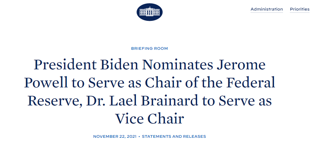 美国时间周一,美国总统拜登宣布提名杰罗姆·鲍威尔连任美联储主席,并提名莱尔·布雷纳德担任美联储系统理事会副主席。