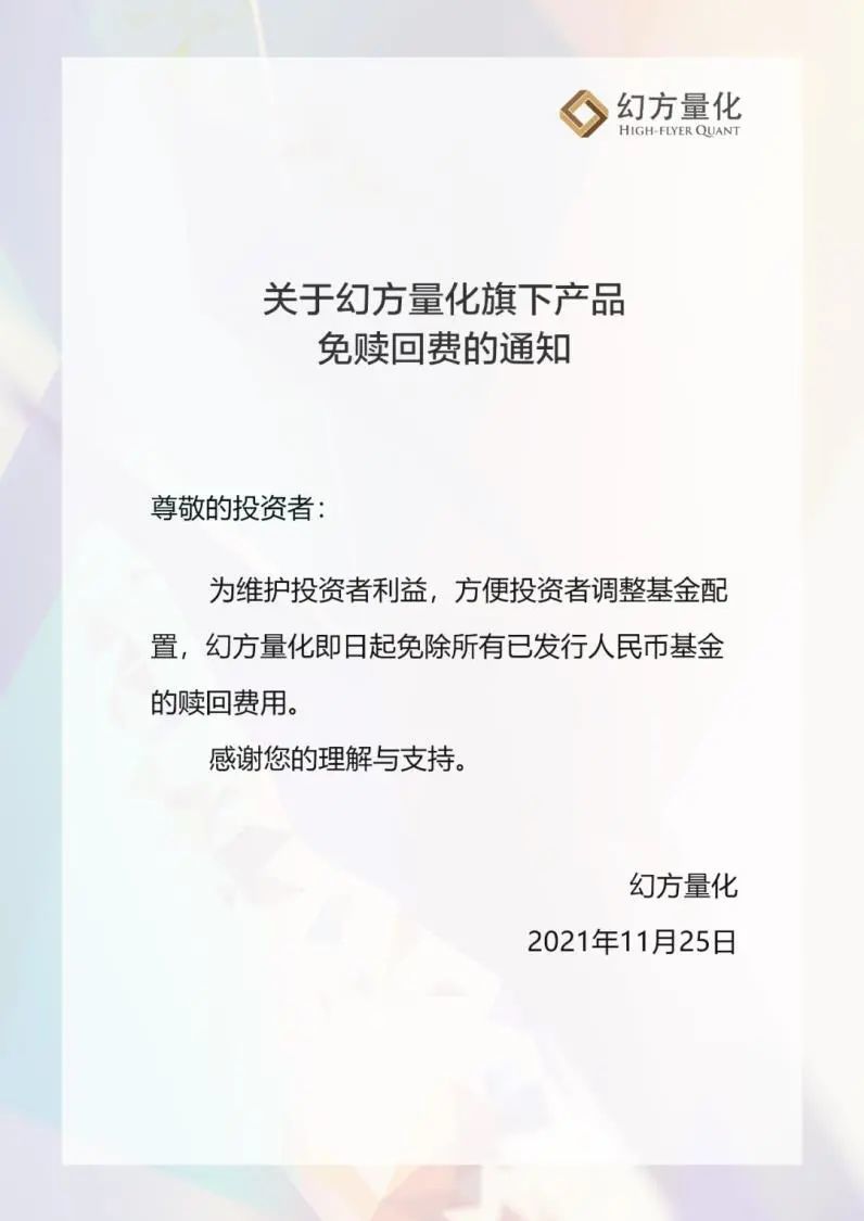 11月25日,头部量化私募 幻方量化 发布通知,即日起免除所有已发行人民币基金的赎回费用。此外,近期已有多家头部量化基金暂停申购。
