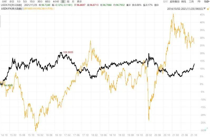 今年上半年, 美元指数 的疲软走势对美股及新兴市场构成支撑。但随着美联储紧缩预期升温, 美元指数 在今年下半年持续攀升,或成为未来新兴市场的一大“逆风”。