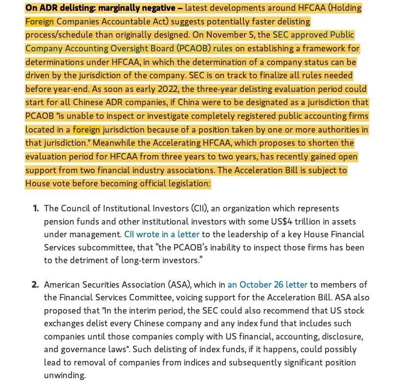 摩根士丹利在近期的研报中提及,关于HFCAA的最新进展表明,退市过程/时间可能比最初设计得更快。最早在2022年初,中国所有中概股公司将开始为期三年的退市评估期。与此同时,《加速HFCAA》提出将HFCAA的评估期限从三年缩短为两年,最近得到了两家金融行业协会的公开支持。加速法案在成为正式立法之前需要众议院投票。