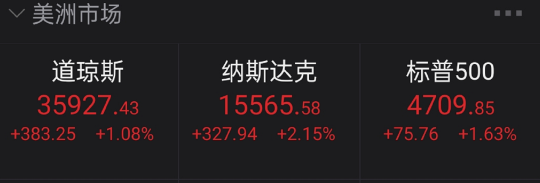 美联储的决议公布后,美股三大指数瞬间大幅跳涨,纳斯达克、标普、道琼斯指数盘中深V反转,尾盘三大指数均刷新盘中最高位,截止收盘,道指大涨超383点,标普500指数涨超1.6%,纳指上涨328点,涨幅超2%。