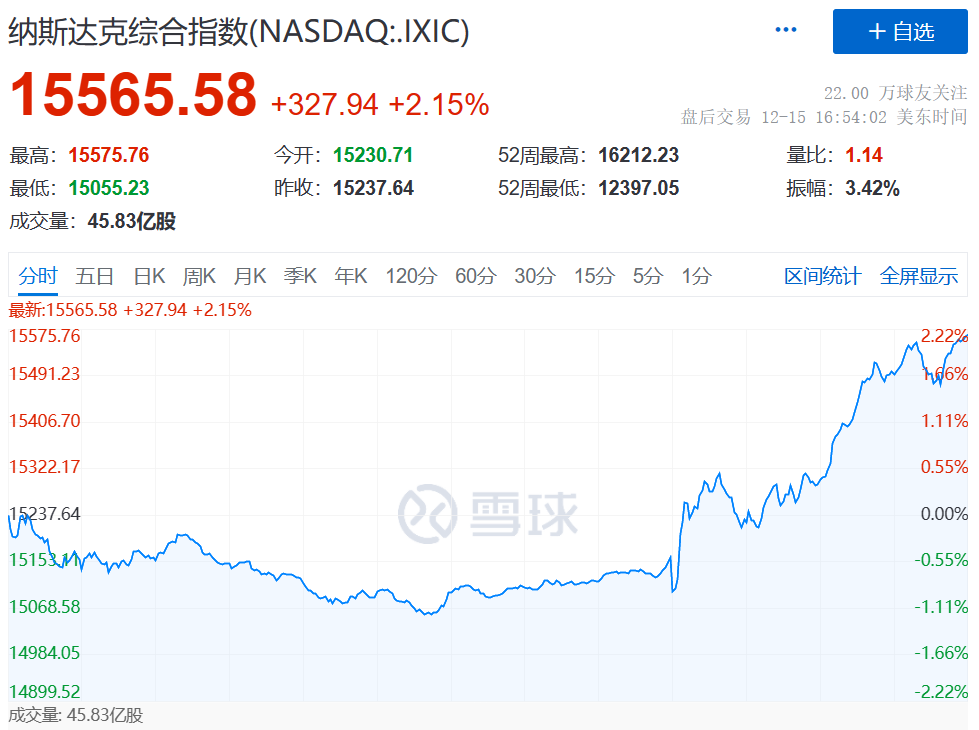 靴子落地,美联储加速缩减购债几乎与预期一致,且加息前景逐渐明确,美股盘中上演大逆转。美联储公布决议公布后,美股三大指数集体跳涨,纳斯达克、标普、道琼斯指数盘中深V反转,在尾盘,三大指数均刷新了日内新高。其中,道琼斯指数从最低拉升超538点,纳指盘中最大涨幅也超510点。