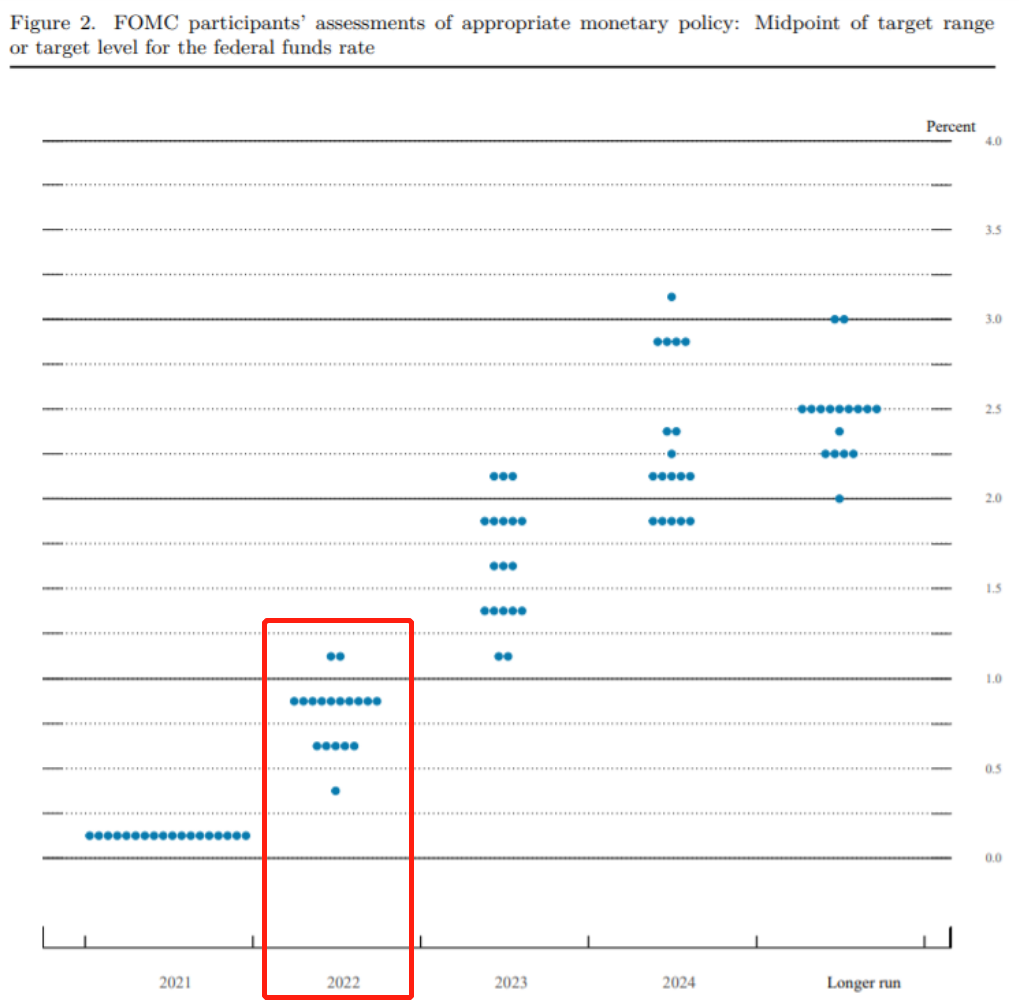 很明显,这份点阵图成为了2021年以来最鹰派的一份点阵图,也意味着,2022年美联储启动加息已经是大概率事件。