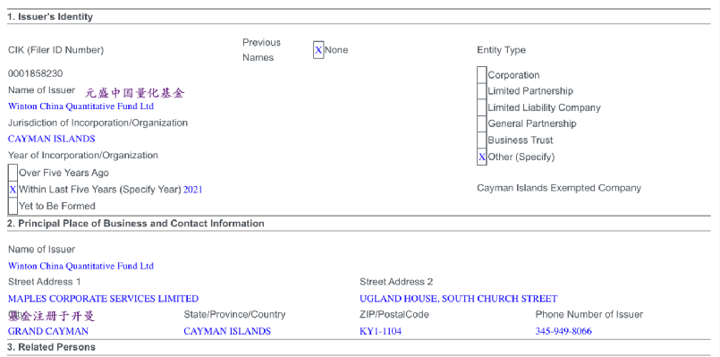 根据美国证监会的信息披露记录,11月9日,元盛中国量化基金提交了基金销售的D表格。表格显示,元盛中国量化基金为首次销售,提交表格时共卖了1450万美元,有两名投资者。