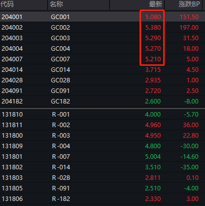 近期,多个逆回购品种表现强势,短期逆回购利率攀升更加明显。比如12月29日沪市1天期、2天期、3天期、4天期、7天期逆回购利率均在5%以上,14天期逆回购利率在12月27日当天一度冲破4%,29日利率有所回落,但收盘仍有3.715%,好于同期的银行理财产品。深市多个短期逆回购品种的回购利率也冲破5%,尾盘期间有所回落,但总体在5%附近。