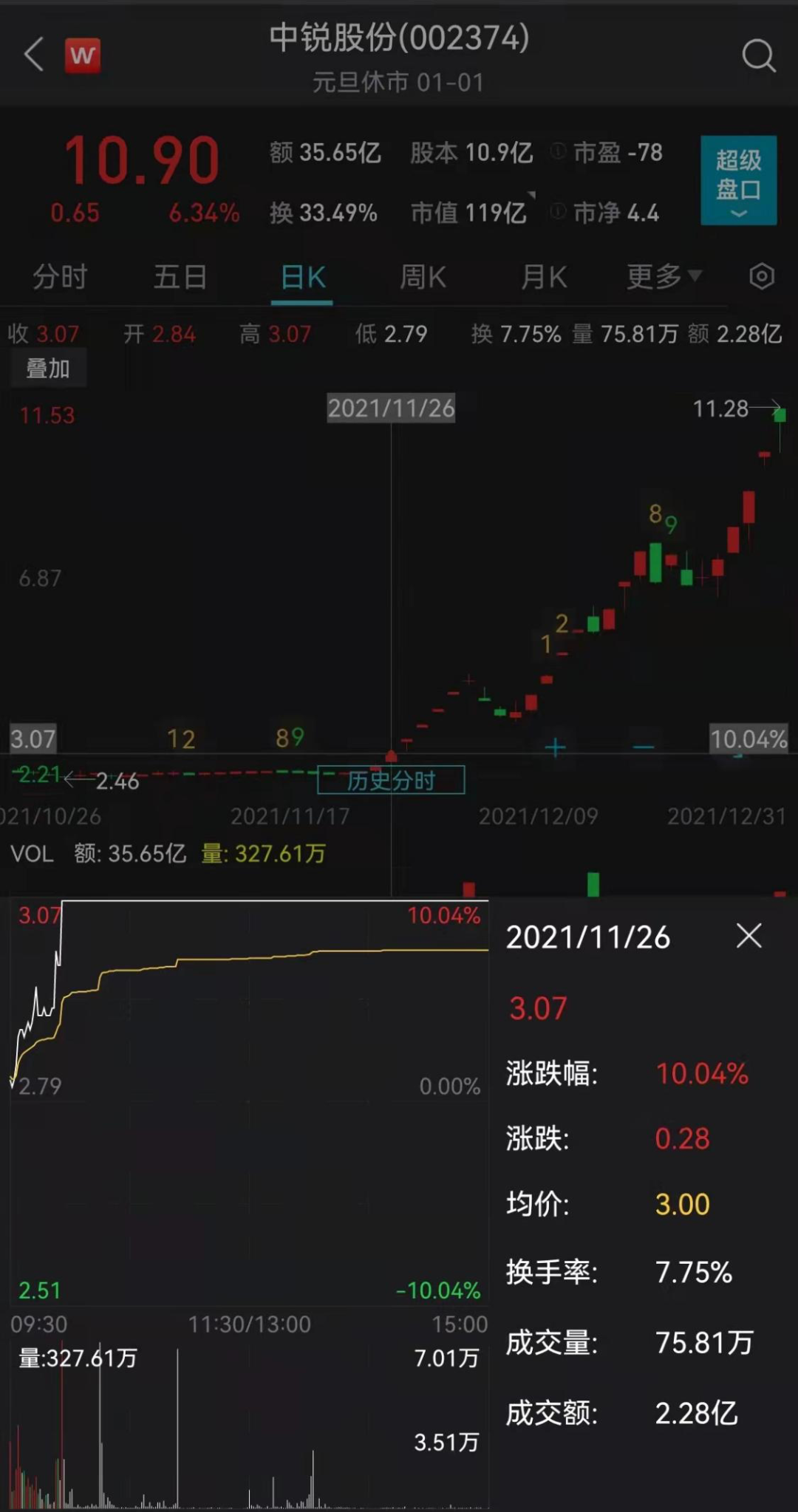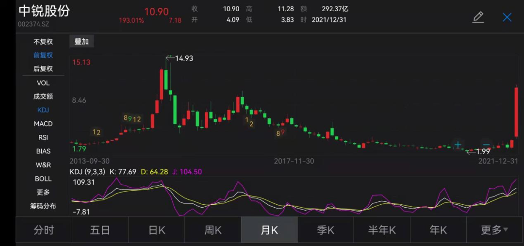 2021年最后一个交易日收盘,中锐股份大涨6.34%,报收10.90元/股,一个半月的时间里,股价大涨3倍。