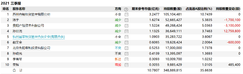 Wind数据显示,2021年第三季度,中锐股份持股5%以上的大股东汤于、贵阳产控资本有限公司、孙世尧大举减持,其中孙世尧减持后持股比例降到5%以下。此外,第六大流通股东赵荣全也没熬住,进行了小幅减持。