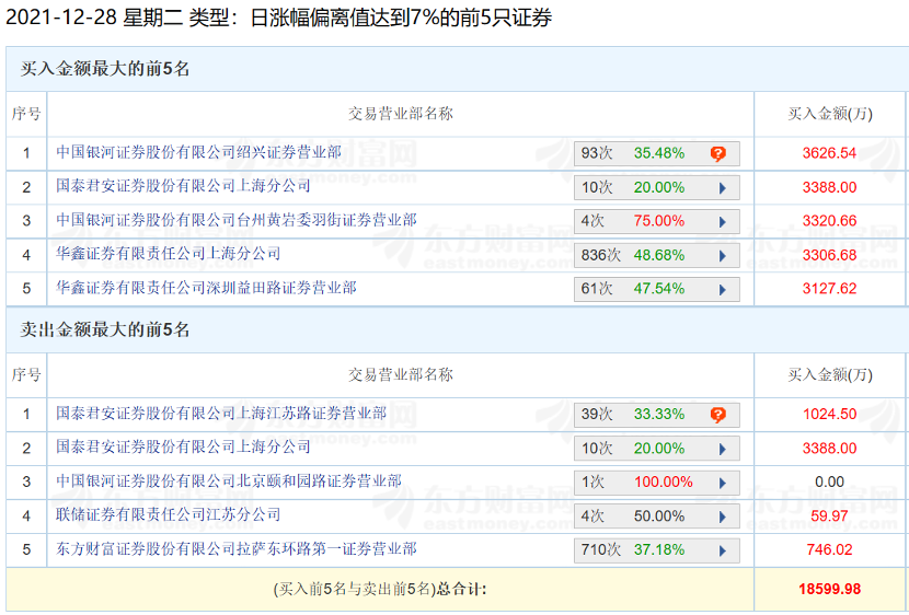 值得注意的是,市场人士认为的知名牛散“赵老哥”所在的银河证券绍兴营业部也在高位接盘。龙虎榜显示,12月28日,银河证券绍兴营业部在买一席位上买入3626.54万元。