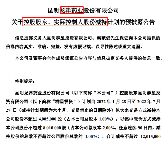 根据龙津药业公告,公司控股股东昆明群星投资计划自2022年1月28日至2022年7月27日(减持计划期间为六个月,交易禁止的日期除外)以大宗交易方式减持公司股份不超过400.5万股(占公司总股本1%),以集中竞价方式减持公司股份不超过801万股(占公司总股本2%,任意连续90日内,减持股份的总数不得超过公司股份总数的1%),合计减持不超过1201.5万股(占公司总股本的3%)。