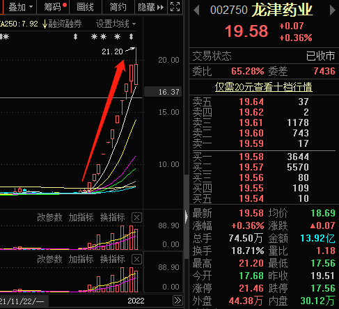 龙津药业从上个月22日开始至1月5日,作为中药概念连板空间龙头收出连续10个涨停,从7.53元来到19.51元,涨幅159%。