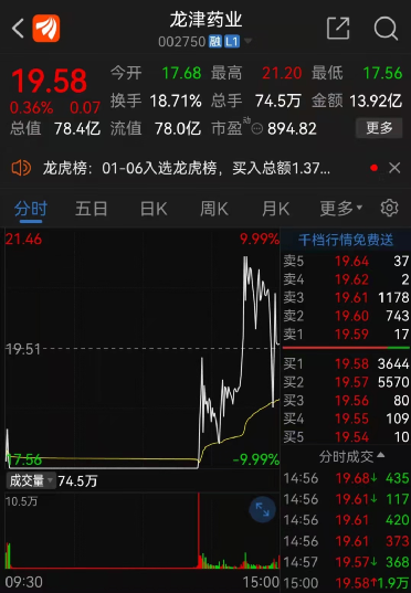 而1月6日,龙津药业大幅低开,随后很快跌停,盘中一度拉升冲高至上涨8个点,但尾盘最终宽幅震荡后回落,盘中上蹿下跳,收盘勉强翻红,收涨0.35%。