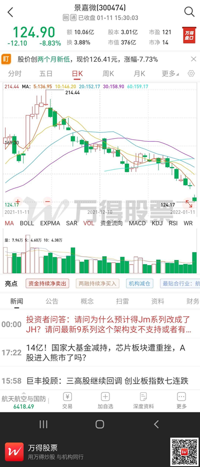 受大基金减持影响,1月11日,国科微和景嘉微都以下跌报收,尤其是景嘉微大幅下探8.83%,报收124.9元,较最高价214.44元已跌去40%以上。