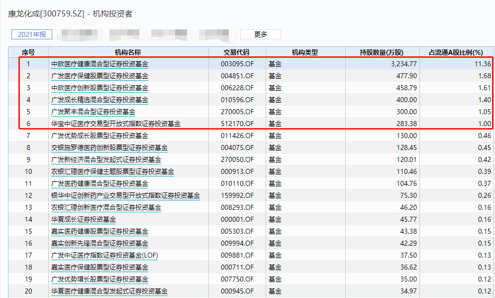 康龙化成是葛兰的代表作中欧医疗健康的第5大重仓股,持仓比例为5.9%;该基金也是目前看来持仓康龙化成最多的公募基金,持股3235万股;此外,广发、交银、农银汇理等多家基金旗下也有主动基金持仓。