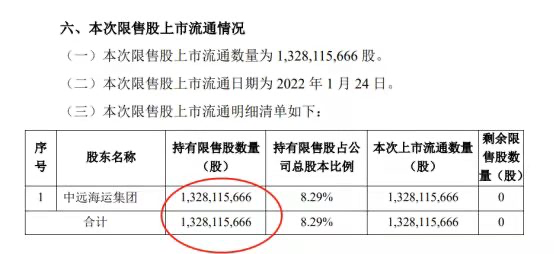 中远海控近日公告,间接控股股东中远海运集团持股的13.28亿股,将于1月24日解禁,这些股份是三年前定增的股份。如今解禁市值222亿元。