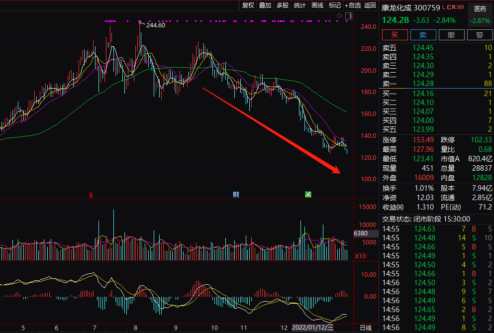 由于医药股股价持续回调,康龙化成的股价实际上已经出现了较大的下跌,高位的224元到最新的124元,股价已经接近要腰斩,下跌风险已经得到较大释放。