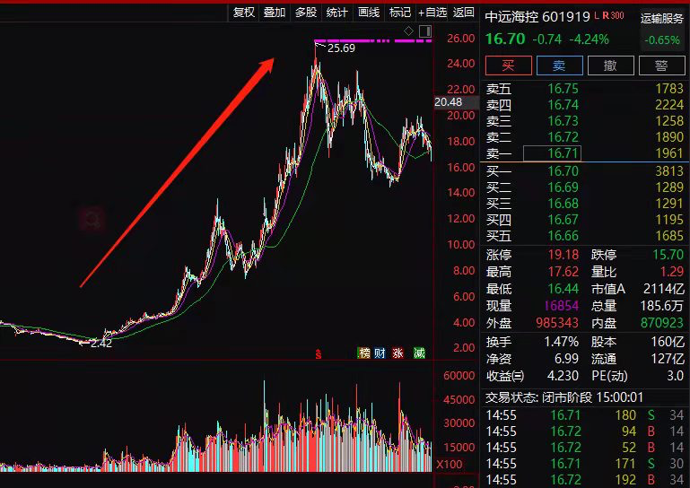 海运大牛股,2020年5月到2021年7月就暴涨10倍的大牛股中远海控,3年前的定增,控股股东如今要解禁了,浮盈赚得盆满钵满。