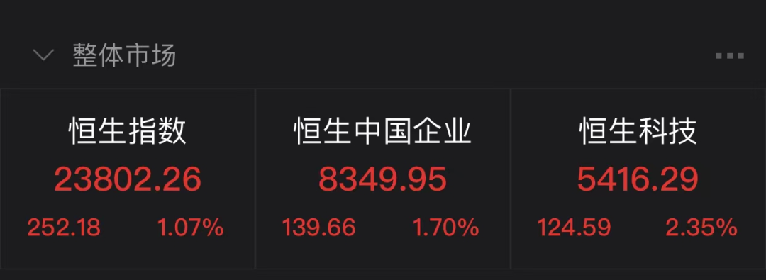 截至31日收盘,港股主要指数全线大涨,恒生指数上涨1.07%,报23802.26点;恒生中国企业指数上涨1.70%,报8349.95点;恒生香港中资企业指数涨0.75%,报4121.07点;恒生科技指数涨2.35%,报5416.29点。