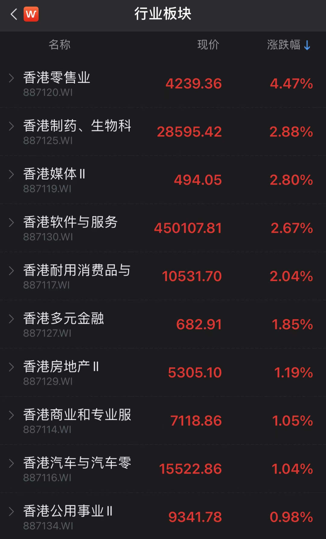 Wind港股行业指数中,零售、制药、媒体、软件、耐用消费品等板块涨幅居前。