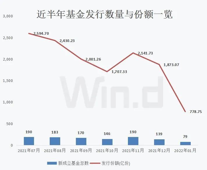 由于公募基金重仓股连续杀跌,基金发行遇冷。Wind数据显示,近半年基金发行的数量与份额大幅下降。2022年1月基金发行份额不到半年前的三分之一。