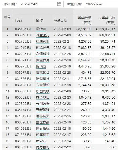 图 / 北交所2022年2月20家获解禁个股名单及解禁数量