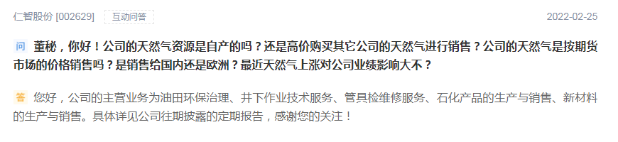 在互动易中,有投资者向仁智股份提问:“最近天然气上涨对公司业绩影响大不?”