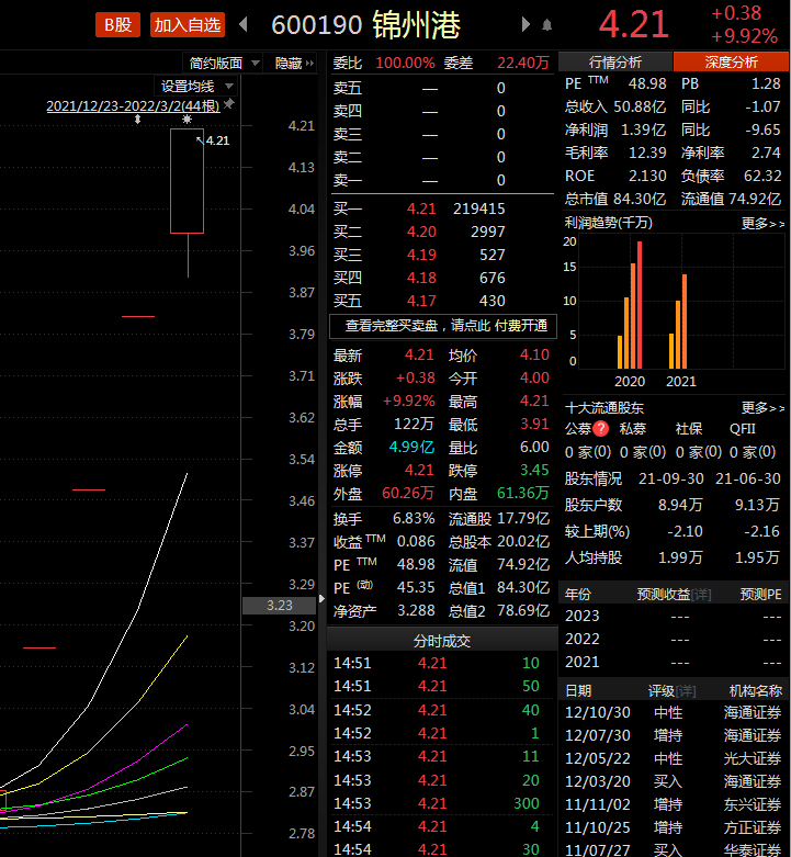 公司是锦州港主要港口运营企业。主要从事油品、粮食、金属矿石和钢材等大宗货物的装卸、堆存、运输等港口业务,截至目前主营业务未发生变化。公司股票连续3个交易日涨停,短期内价格波动幅度较大。截至3月1日收盘,公司收盘价格为3.83元,连续3个交易日区间涨幅为33.45%,静态市盈率为41.01倍,动态市盈率为44.56倍,公司当前的市盈率远高于同行业上市公司平均水平。公司建议投资者注意二级市场交易风险,理性决策,审慎投资。