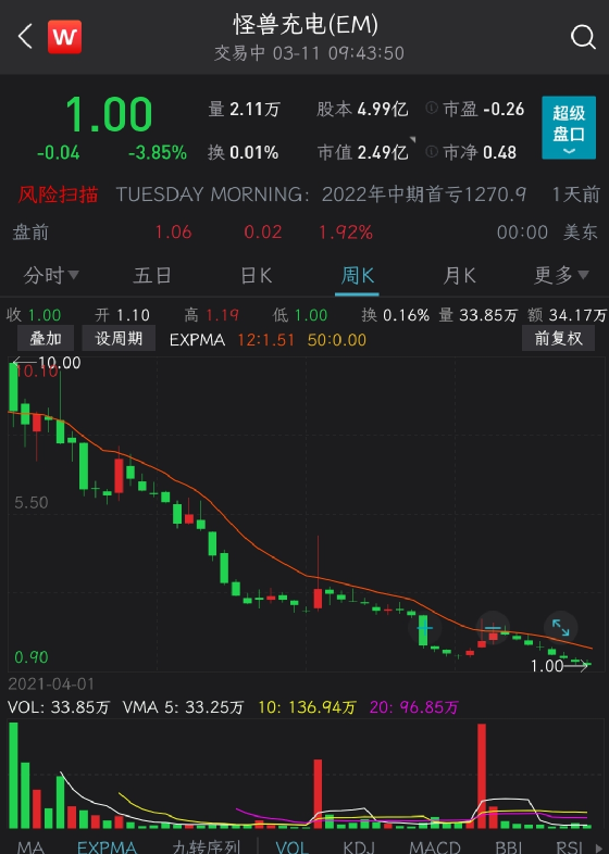怪兽充电自2021年4月上市以来,股价一路走低。年报公布后,截止记者发稿时,公司股价跌近4%,目前1美元的股价较8.5美元的发行价已经下跌88%。