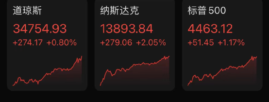 截至收盘,道琼斯指数收盘上涨0.80%,报34754.93点;纳斯达克指数涨2.05%,报13893.84点;标普500指数涨1.17%,报4463.09点。