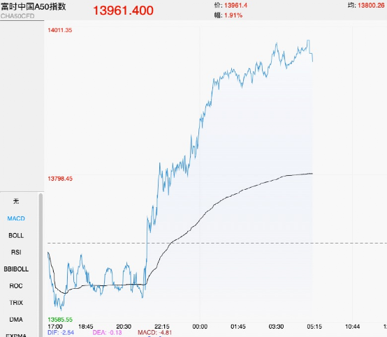 中概股大涨之际,夜间,富时中国A50指数也涨近2%。
