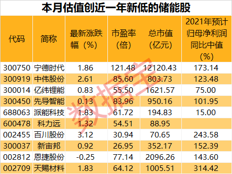 从业绩上来看,近一年来估值新低的储能股除科力远尚未发布公告外,其余概念股2021年业绩预告均为预增,年报发布后其滚动市盈率有望进一步降低,天赐材料、百川股份、宁德时代、新宙邦、恩捷股份、中伟股份预告同比增幅均在100%以上。
