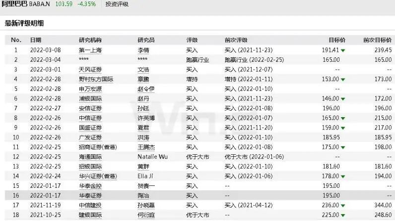 Wind数据显示, 阿里 年初至今跌幅超过10%,机构对 阿里 的投资评级依旧买入居多,但一致下调了目标价。