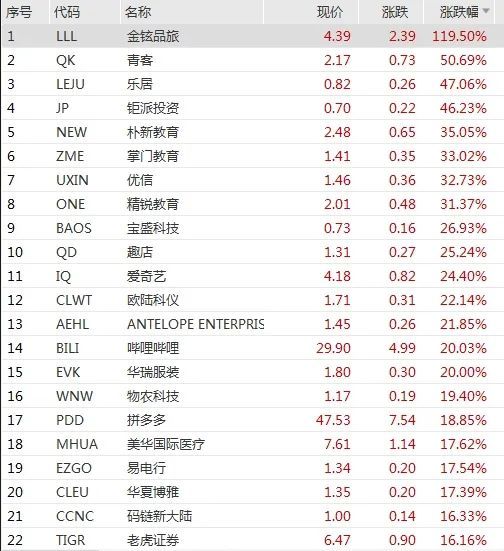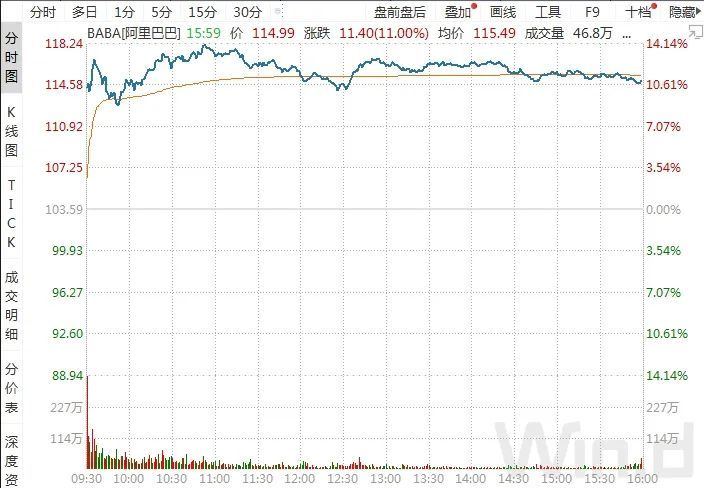阿里巴巴 港股3月22日高开高走,最终收涨11%,中概股受此提振纷纷大涨,乐居涨47.06%,朴新教育涨35.05%,优信涨32.73%,精锐教育涨31.37%,趣店涨25.24%,爱奇艺涨24.4%,哔哩哔哩涨20.03%,拼多多涨18.85%,阿里巴巴涨11%,京东涨5.35%。