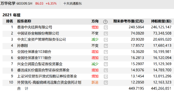 同时新进了“化工茅”万华化学,外贸信托-高毅晓峰鸿远信托计划持有1216.33万股,期末持股市值达到12.29亿元;傅鹏博管理的睿远成长价值基金也增持了该股,但谢治宇管理的兴全合润则减持了。万华化学发布的2021年年报显示,公司去年实现营业收入1455.38亿元,同比增长98.19%;实现归属于上市公司股东的净利润246.49亿元,同比增长145.47%。