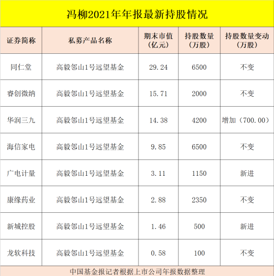 冯柳也继续持股海信家电,持股数量为6500万股,期末持股市值为9.85亿元;另外还对康缘药业、龙软科技保持持股不变。